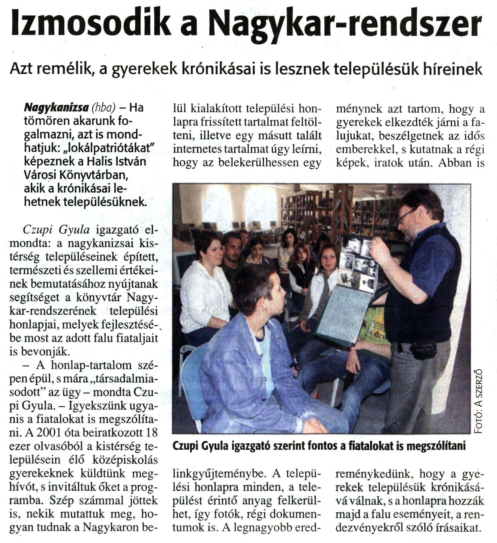 Nyilvános 14438 | 28808 | Zalai Hírlap 2008. június 9. 133. szám 12. oldal - Izmosodik a Nagykar-rendszer | A cikk szövege: Izmosodik a Nagykar-rendszer Azt remélik, a gyerekek krónikásai is lesznek településük híreinek Nagykanizsa (hba) - Ha tömören akarunk fogalmazni, azt is mondhatjuk: „lokálpatriótákat" képeznek a Halis István Városi Könyvtárban, akik a krónikásai lehetnek településüknek. Czupi Gyula igazgató elmondta: a nagykanizsai kistérség településeinek épített, természeti és szellemi értékeinek bemutatásához nyújtanak segítséget a könyvtár Nagykar-rendszerének települési honlapjai, melyek fejlesztésébe most az adott falu fiataljait is bevonják. - A honlap-tartalom szépen épül, s mára „társadalmiasodott" az ügy - mondta Czupi Gyula. - Igyekszünk ugyanis a fiatalokat is megszólítani. A 2001 óta beiratkozott 18 ezer olvasóból a kistérség településein élő középiskolás gyerekeknek küldtünk meghívót, s invitáltuk őket a programba. Szép számmal jöttek is, nekik mutattuk meg, hogyan tudnak a Nagykaron belül kialakított települési honlapra frissített tartalmat feltölteni, illetve egy másutt talált internetes tartalmat úgy leírni, hogy az belekerülhessen egy linkgyűjteménybe. A települési honlapra minden, a települést érintő anyag felkerülhet, így fotók, régi dokumentumok is. A legnagyobb eredménynek azt tartom, hogy a gyerekek elkezdték járni a falujukat, beszélgetnek az idős emberekkel, s kutatnak a régi képek, iratok után. Abban is reménykedünk, hogy a gyerekek településük krónikásává válnak, s a honlapra hozzák majd a falu eseményeit, a rendezvényekről szóló írásaikat. Képaláírás: Czupi Gyula igazgató szerint fontos a fiatalokat is megszólítani |